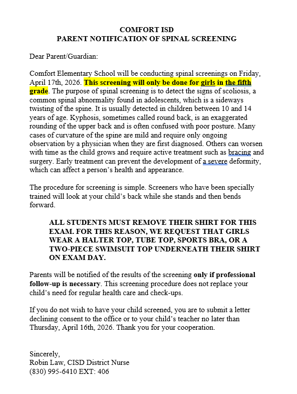 Statewide Emergency Alarm DRILL Today, April 2, 2026 Comfort ISD Reminder: Public Warning System TESTING Today THIS IS A TEST, ONLY A TEST OF THE PUBLIC WARINING SYSTEMS Dear CISD Families and Community: CISD is required to send notice to our school ...